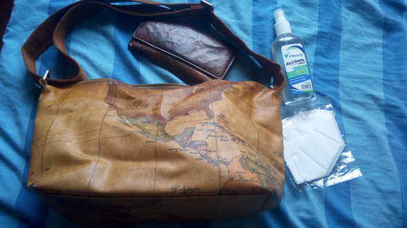 The accessories we should carry in our lady's bag during the pandemic: alcohol and mask to protect us from covid 19.