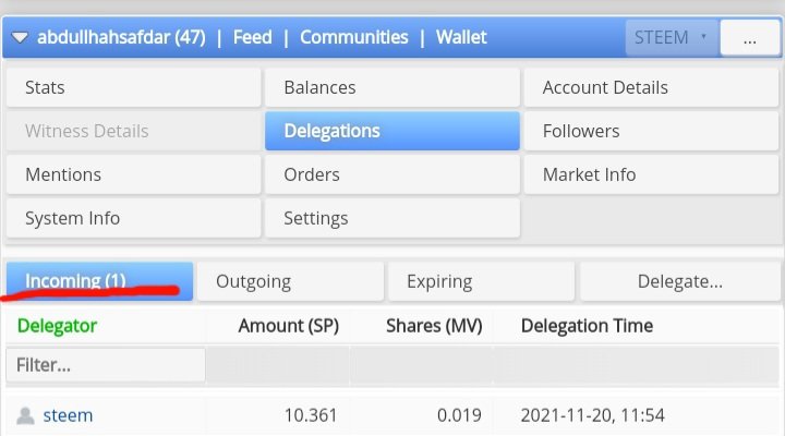 When a steemit user give his/her sp to you then this will shown in incoming tab and it is called incoming Delegation.