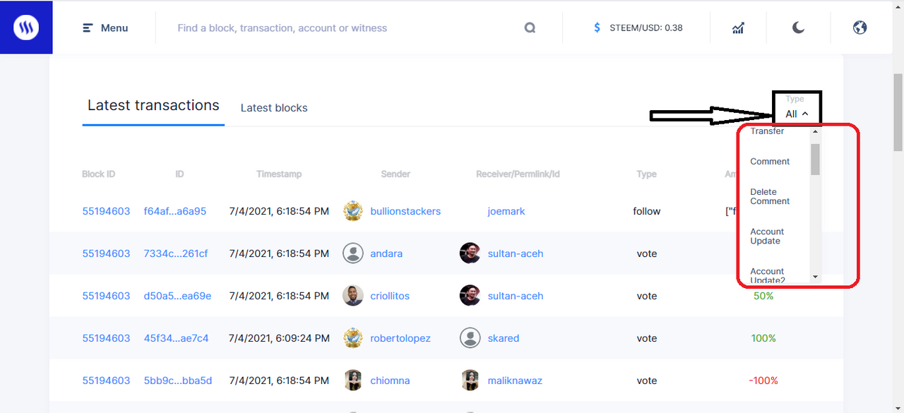 In this page you see in left side and click on Latest transection. In which contains all type of blockchain transection like big and small and other transection. In which you see the option of block ID, ID, timestamp, sender, receiver, and type and amount percentage. The picture given below:
