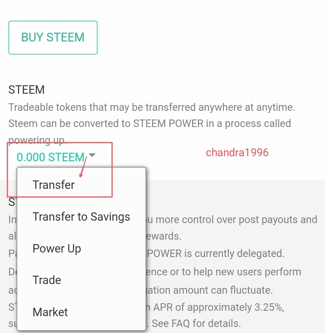 in this screenshot we can easily see a drop-down menu in the steem section, where we can find option for transfer the steem to the other user or other account. When we select the tranfer option it asks us the adress where we want to transfer the steem and it asks us amount also, how much we want to transfer.