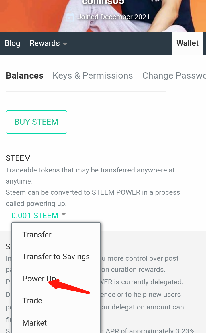 Click on the identified steem balance there and an option rolls down. Below is a sample of it,