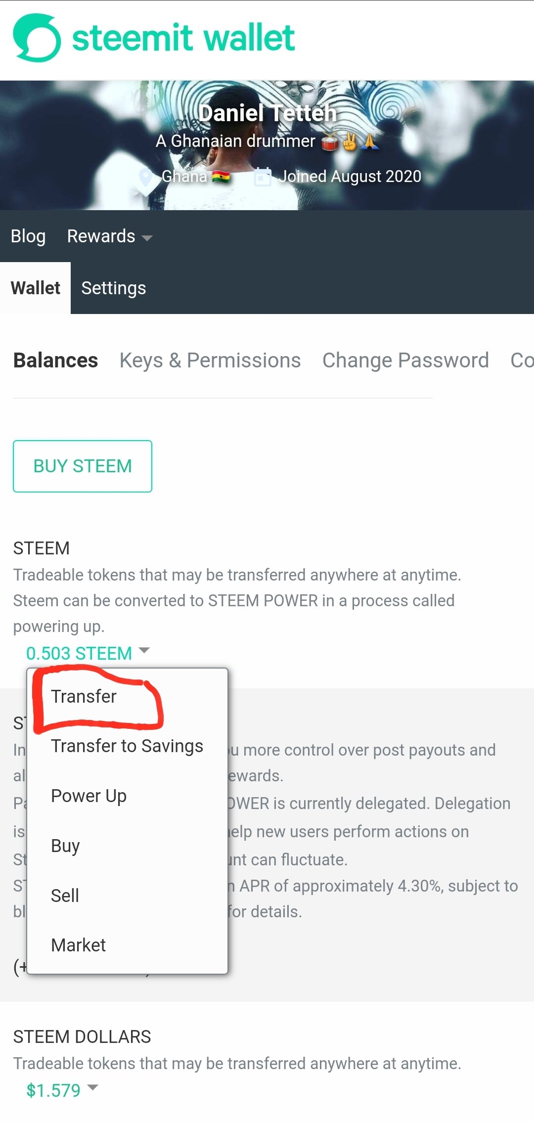 Then I will click on the dropdown beside my steem amount. Then click on transfer