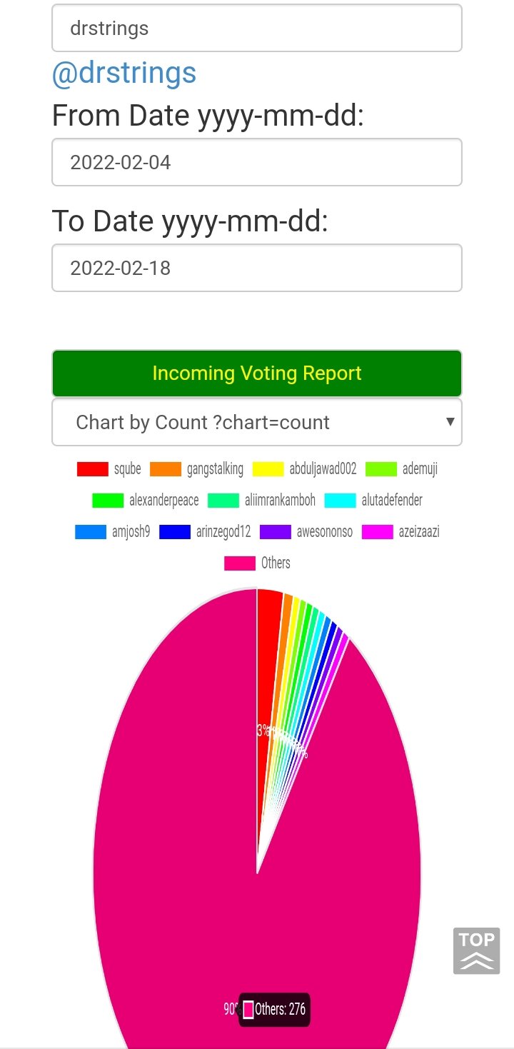 - A pie chart of all your incoming votes within the set time frame will be displayed. You can filter the chart by vote count and vote weight. There is also a tabular format of the incoming votes below the chart.