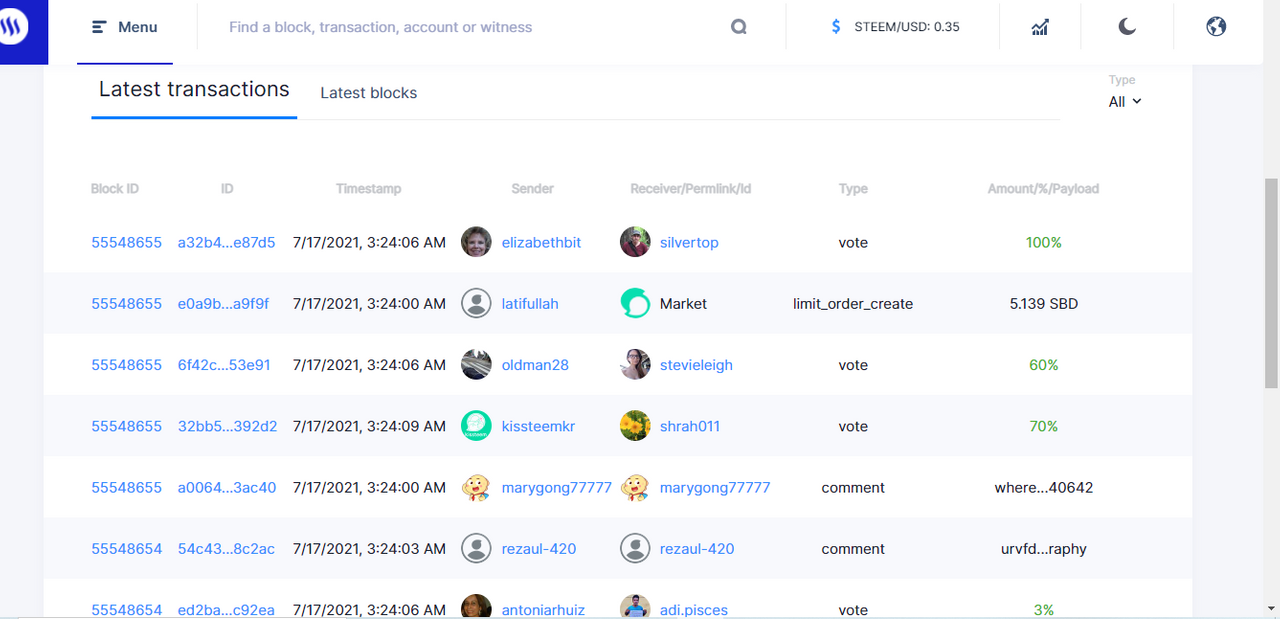 This latest transactions and latest blocks section is below the previously discussed two charts and as show in the image we can get the Block-ID, Sender and Receiver ID, Timestamp, Type of action and the actions percentages with real time.