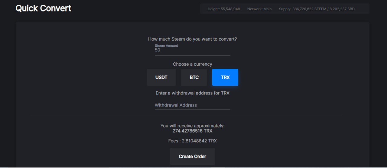 When you click the menu then you will appear this quick convert option and then you have to fill several steps to convert your steems quickly but according to the selected currency you have to pay a fee. Those currencies are USDT,BTC and TRX. Now I'll demonstrate you if we convert 50 steems and then what will be the fee in each currency.
