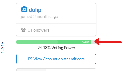 When we enter our name in the search bar our own account details will appear already we have discussed about that, so that at that time you can see a green bar and some percentage value at the right side. That is our "voting power". Here you can see my voting power is 94.13%