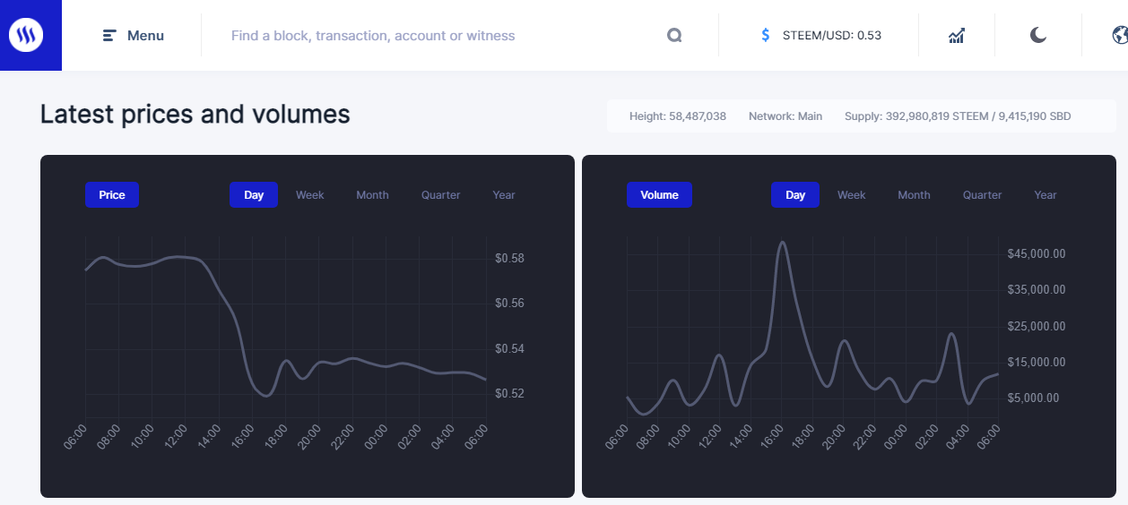 To check the current price and volume of steem, i first logged into steem scan using the link https://steemscan.com/ and this are details and informations i found,