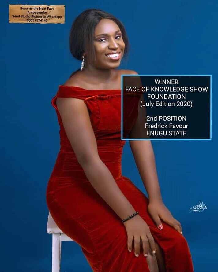 I'm also the runner up of the 2020 Face of Knowledge show Foundation for Enugu state , here is a picture 💪