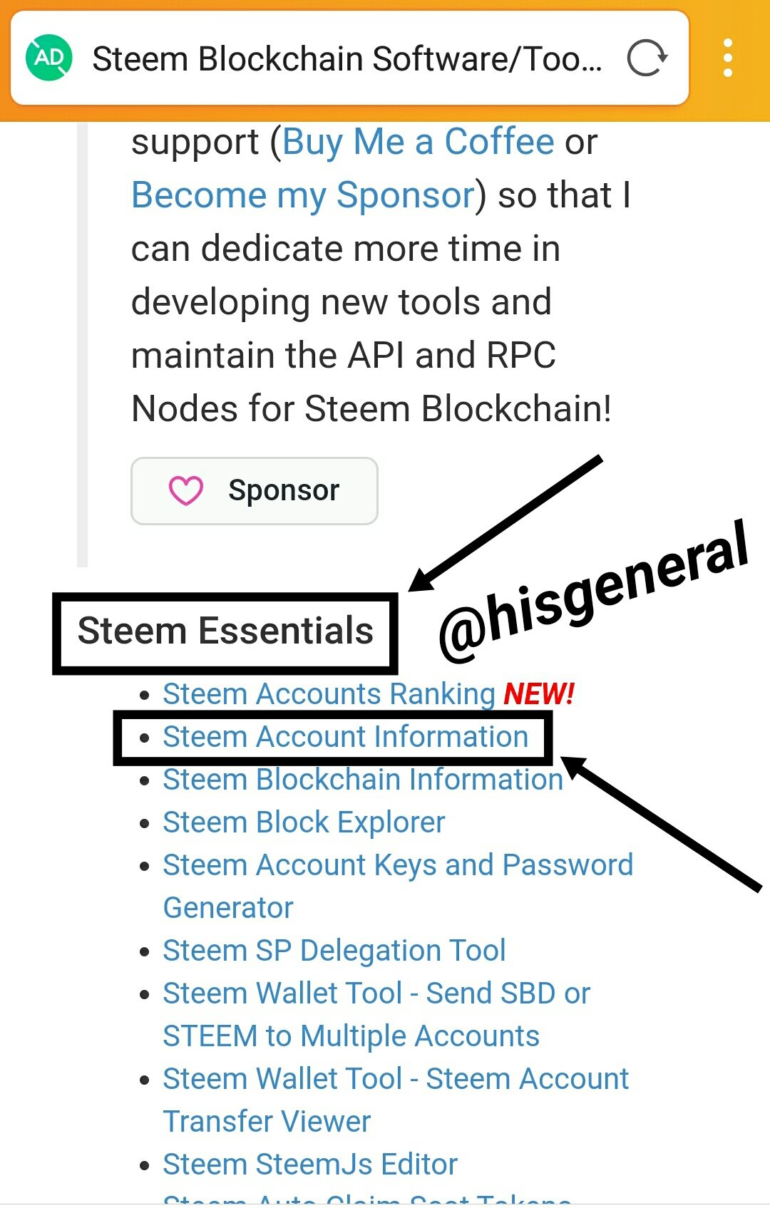 - The various categories of tools are opened, under Steem Essentials, select Steem Account Information