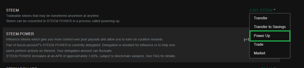 In the Balances tab, I click on the drop-down arrow by my Steem amount.