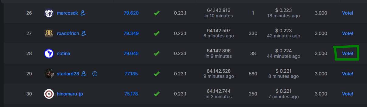 Rank (Rango), Witnesses (Testigo), Approval(MV) (Aprobacion), Status (Estado), Version, Last mined (Ultimo minado), Missed (Omitido), Price feed (Fuente de Precios), Reg fee (Tarifa de registro) y Vote