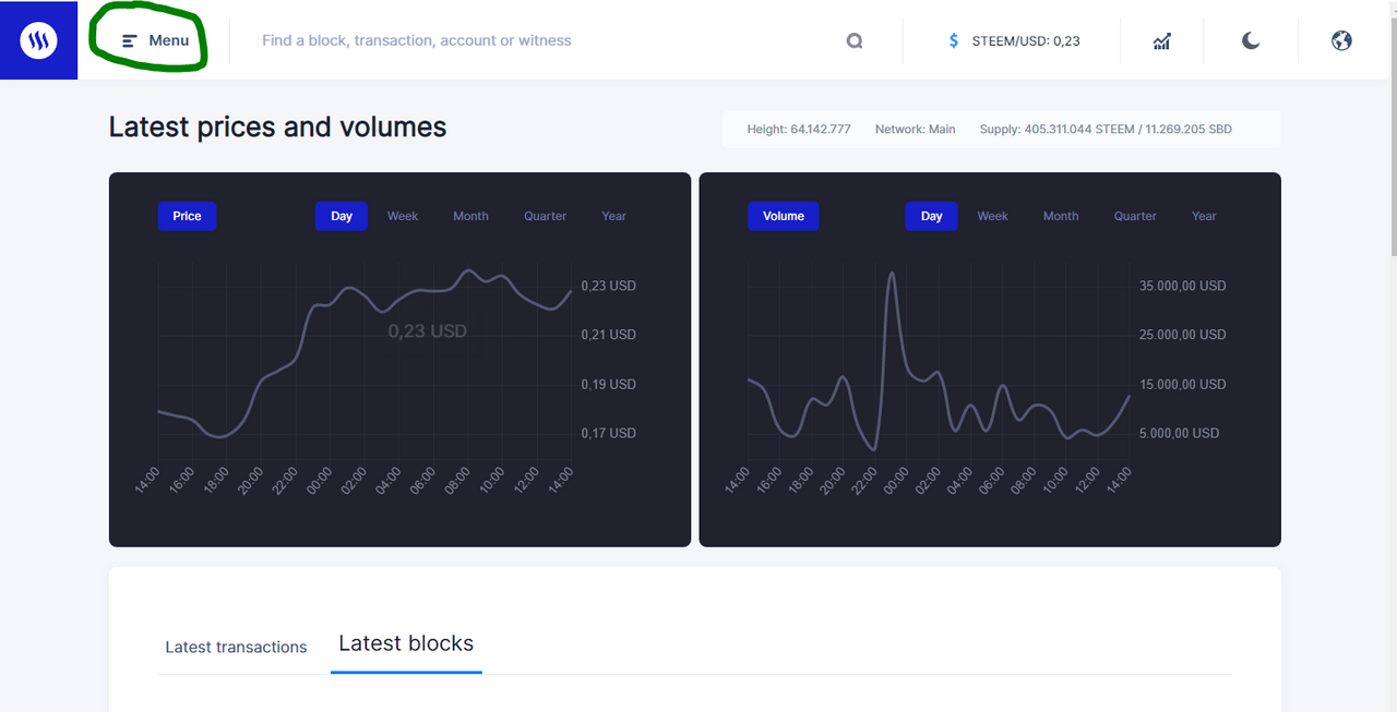 Para poder ver el valor actual y sus volumnes entramos a Steemscan y en su pagina de inicio
