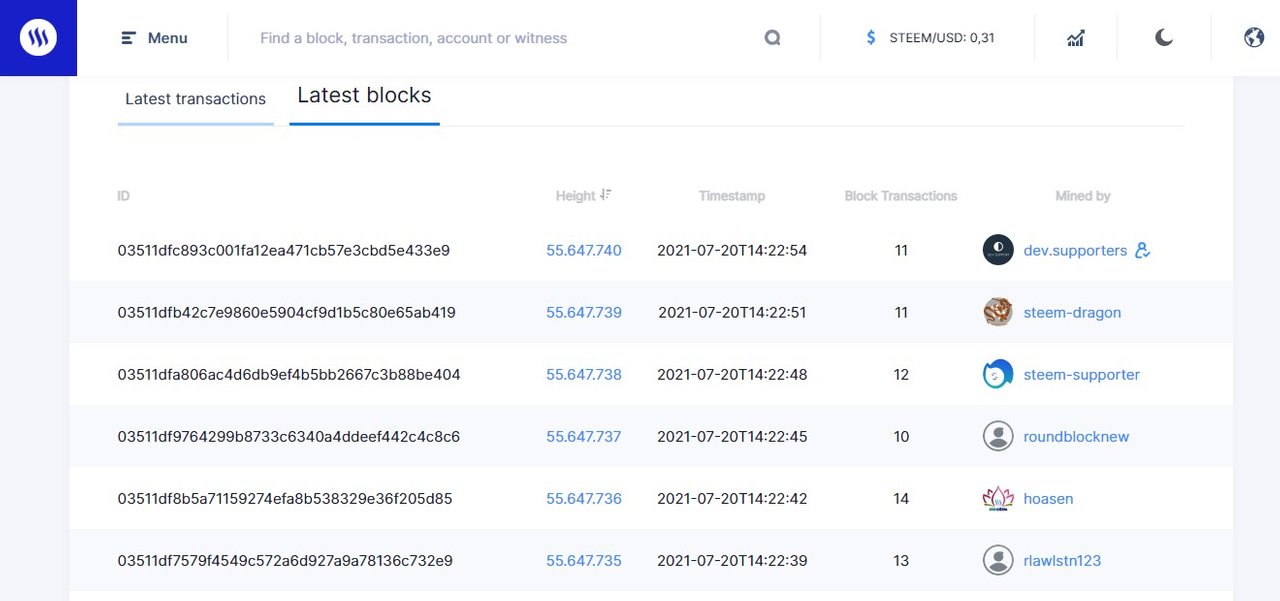 Debajo de "Latest transactions", (Ultimas transacciones, es español)  observamos unos subtítulos en color gris claro que en español significan: ID de bloque, identificación, marca de tiempo, remitente, receptor/enlace permanente, tipo, cantidad/carga útil.