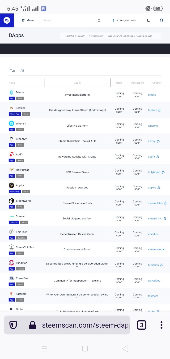 This section helps a user to view several other dapps. It is actually a quick access to other dapps within the steemit blockchain. The features it carries include Name, About, users, transactions and publisher. The image of all the dapps are shown in the image below.