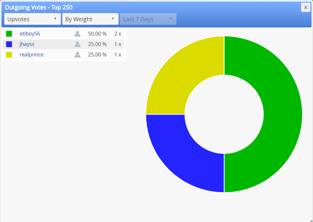 Clicking on the "Out. Votes" would give you the a graphical pie-chart representation of your outgoing votes either by Weights, by Amount or by Count, like below;