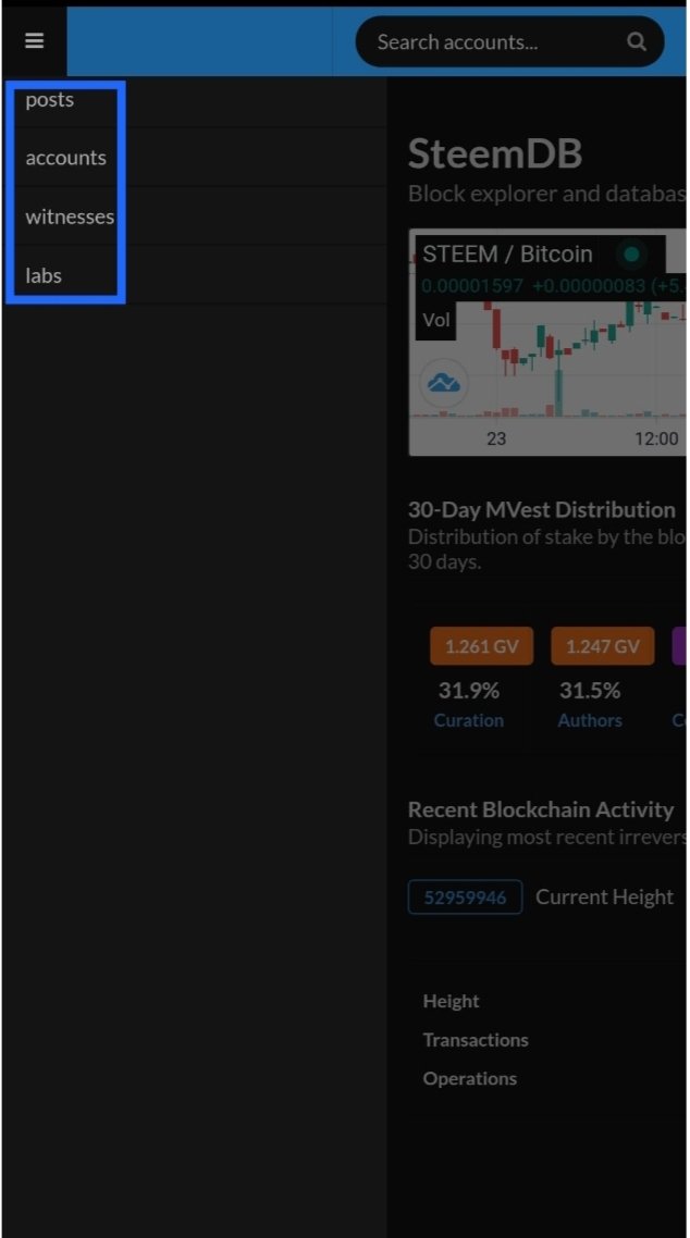 Dari gambar halaman awal kita dapat mengetahui bahwa steemdb.io merupakan blok explorer yang terintegrasi dengan steem blockchain, dan stemdb.io ini juga mempunyai beberapa menu yaitu : SteemDB, Account Post, Witnesses dan Labs.
