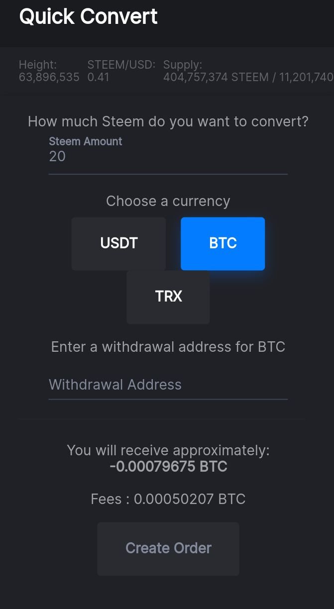 When you click on the menu button you can see the quick menu convert option. You can then enter the amount, select the currency, enter the receiving address and create the order, You can see some transaction fees are charged. The minimum amount you can order is 20. I have entered 20 steems to convert.