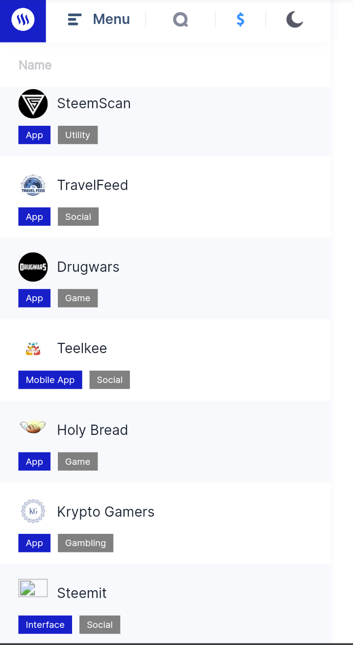 DApps (Decentralized Applications) integrated on the Steem Blockchain are displayed when navigated to the DApps button. The first three DApps from the screenshot above are, Epic Dice, Dtube and Tasteem.