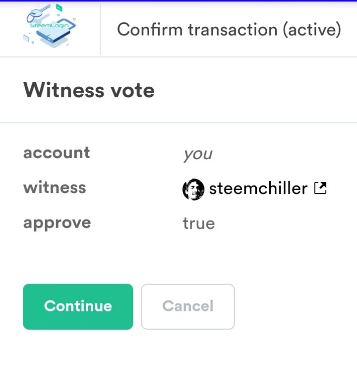 and choose a witness of your choice, click on vote and a page will pop up then you click on continue,