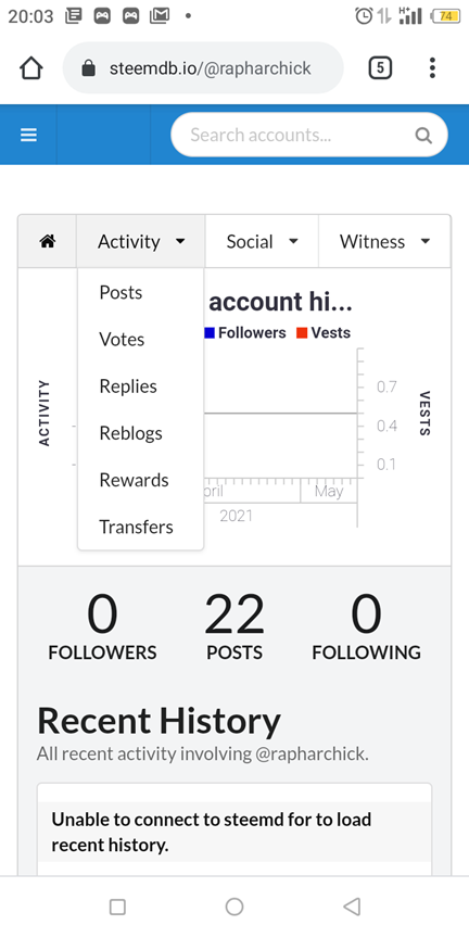 Next, we wanna see how a user can check their recent blockchain activity using the steemdb.io platform