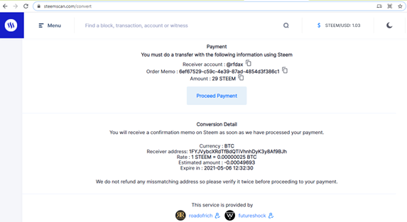~choose the currency you want to convert your steem into (USDT, BTC, TRX)
