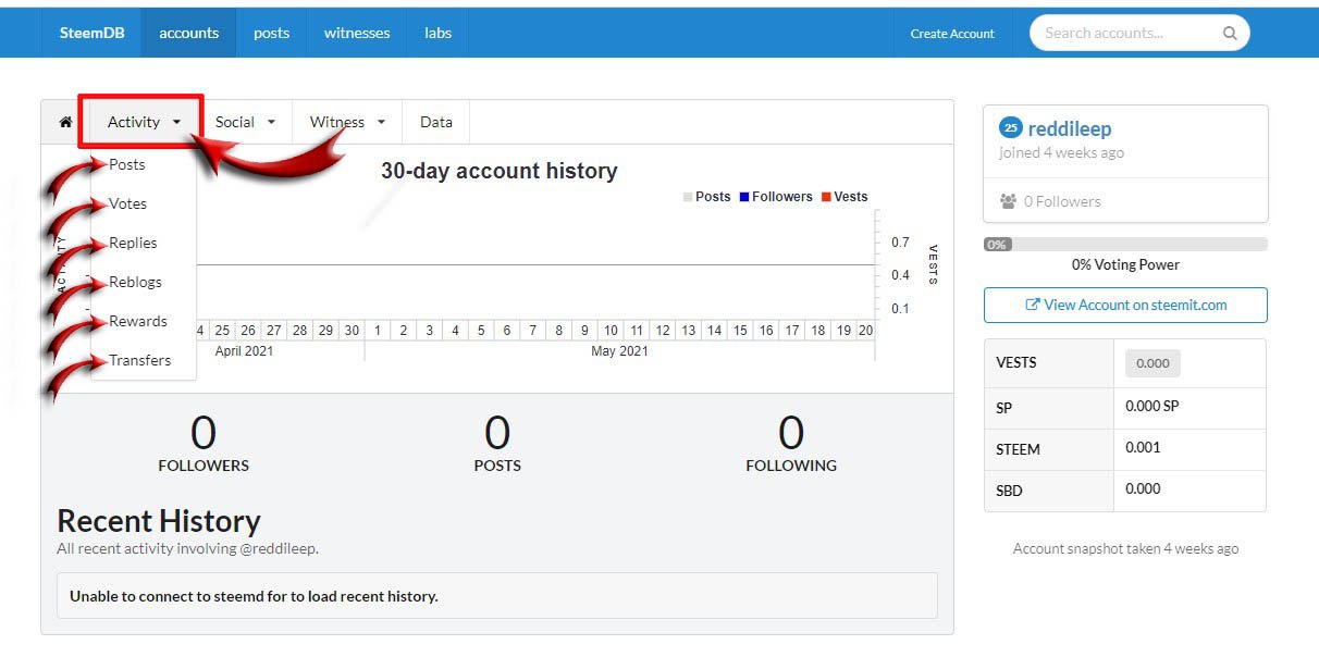 - STEP 2 - After searching our account, we can select "activity" from the drop-down menu. Then we can see "Posts, Votes, Reblogs, Replies, Reblogs, Rewards, Transfers, etc...". We can select any of them. ( Check the attached image for better understanding)