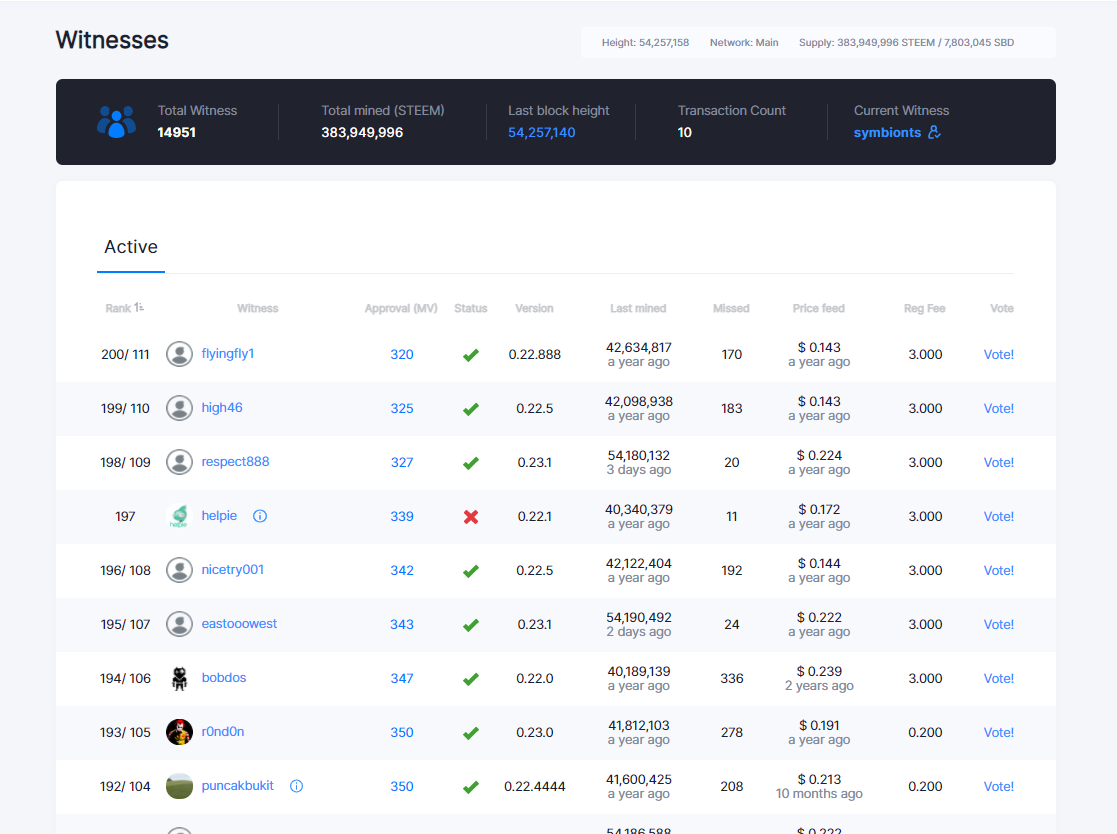 This Chart is showing all the active witnesses with their rank, status and version, price feed, and reg Fees. You can also vote from here by stem login.