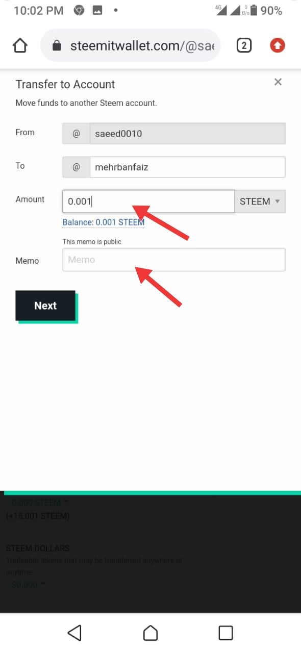 Enter the username where you transfer,steem numbers and memo.then click on next.