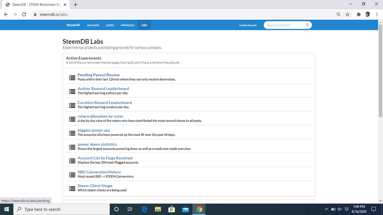 Under this head, we get to know of all the various experimental pages that don't have a home on the site yet. But this website serves as the testing grounds for those projects. And when it is fully ready to use, then we might see those projects on SteemDB in the future.