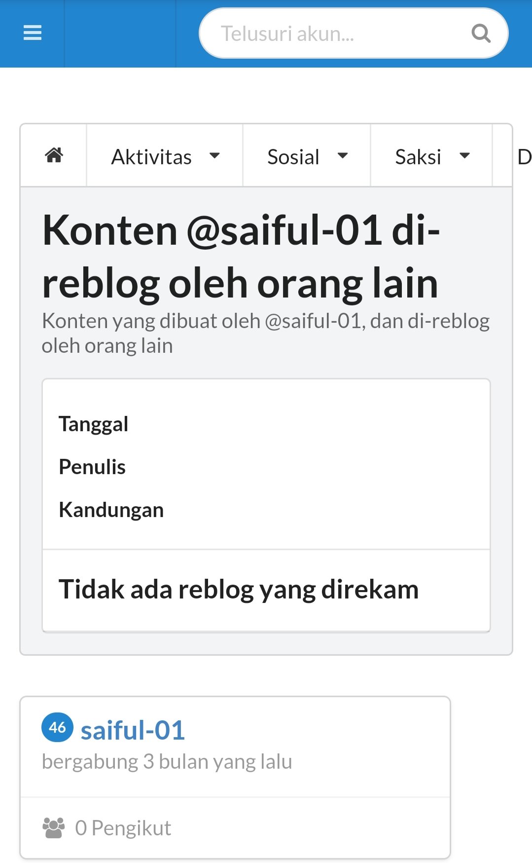 Cara mengetahui siapa saja yang mereblog postingan kita adalah dengan menuju ke menu Sosial. Di menu Sosial ada 3 sub yang terdiri dari follower, following dan rebloging. Di situlah kita bisa melihat semuanya.