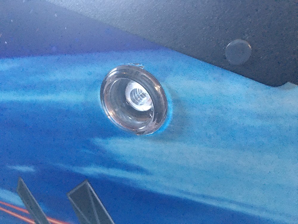 I didn't have a button with the accompanying thin piece to try to cram through there. The button that was on the machine previous to the new one was inside the machine, but it was removed because it had issues. As it was, I couldn't get the piece in the cabinet out anyway. Come to find out when I called the expert that it wasn't the right sized button. He told me it was probably jammed in there and would need to be forcibly removed. I tried prying it from the outside and pushing it or unscrewing it from the inside, but nothing worked. I didn't try bashing it, though, which sounded like what I needed to do.