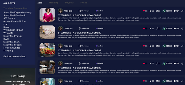 The category is divided into New POSTS/Trending Posts / Popular Posts / MUTED, but we have plans to change the category, such as VIEWS or POPULAR posts for each community. This part is omitted in the design phase because it needs to be reviewed once more in the actual development phase.