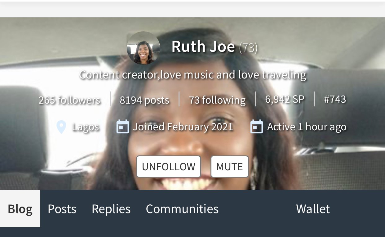 The author of the post is @ruthjoe she has been a consistent author and a force to reckon with. She has a reputation of 73 and from Nigeria. She serves as an MOD in two communities which are steem for Nigeria and Steem For Ladies Community. She’s a prolific writer and a friend.