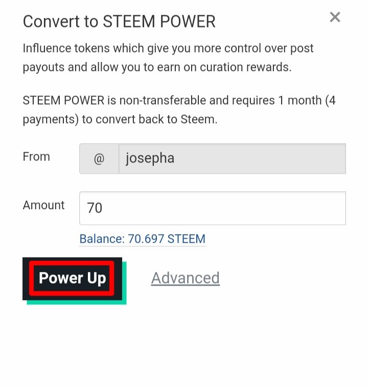 The amount of STEEM that I power up is 70 STEEM. Since power-up is very important to me and every other Steemit user, I was happy to power up the 70 Steem that was available in my wallet.