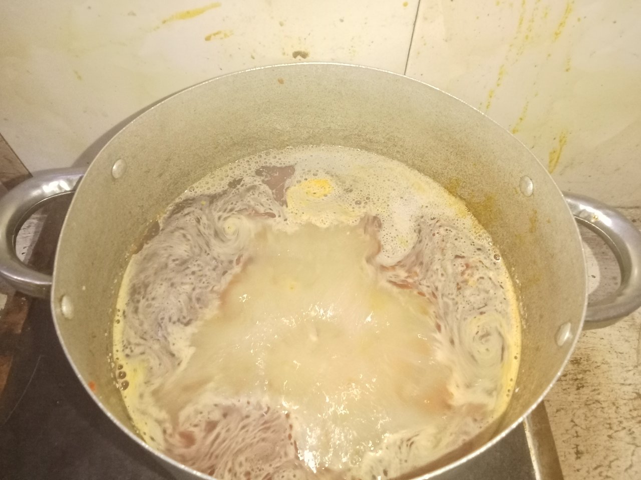 Step 3: I removed the meat from the pot kept it aside and added water to the pot, which I allowed to boil well after which I added red oil and allowed to cook for some minutes before I then added ogbono into it.