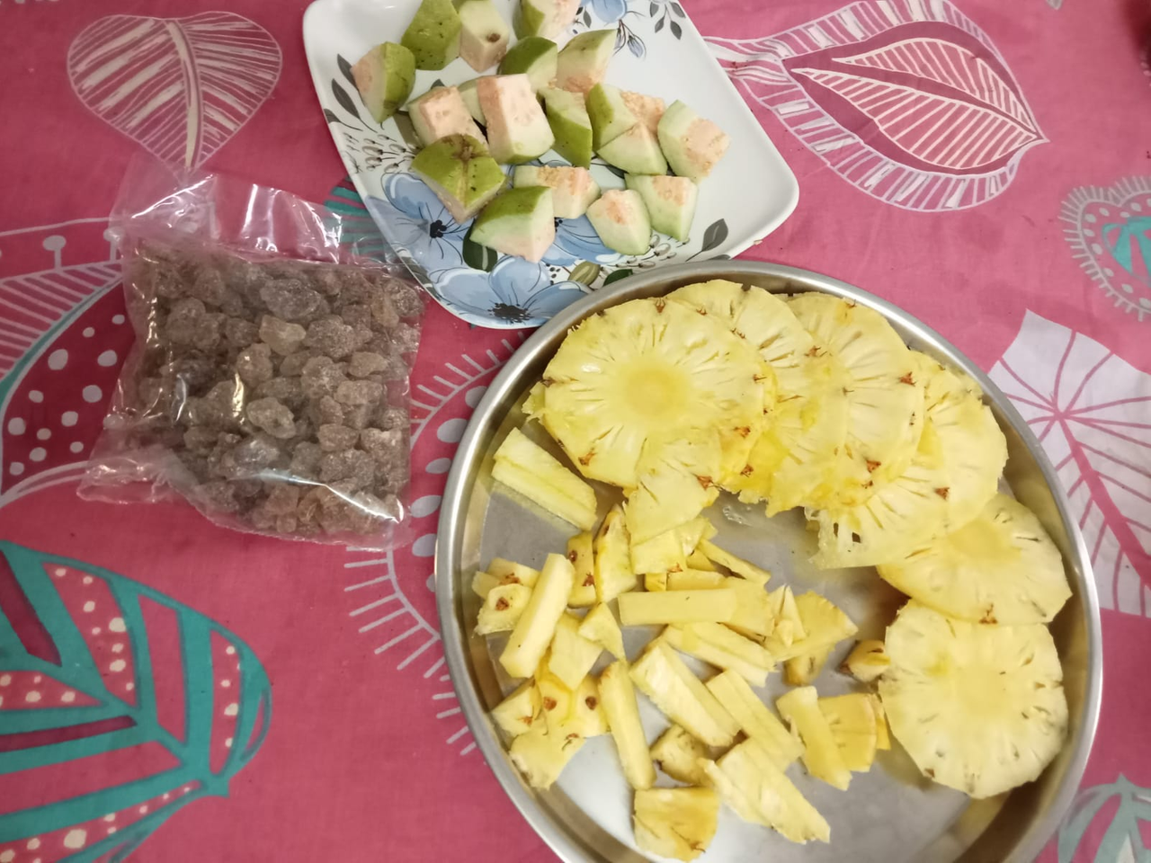 After that in the afternoon, I took a pineapple fruit and cut it into small pieces on a plate, cut a guava fruit into small pieces and put it on a plate, and kept a bag of "Panakarkandu" a sugar candy made from palms to eat with it.