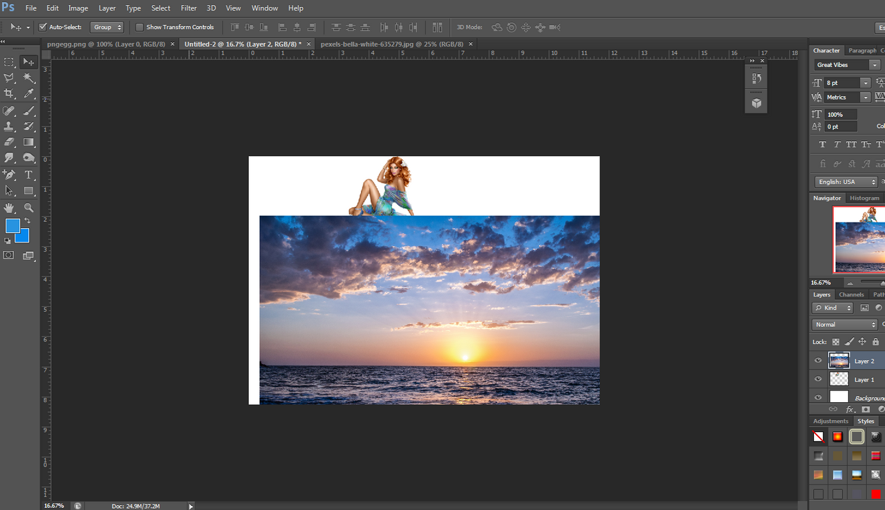 Allign and place the girl picture a ovelapng on the nature seanery , flip it if yo want as shown in the picture