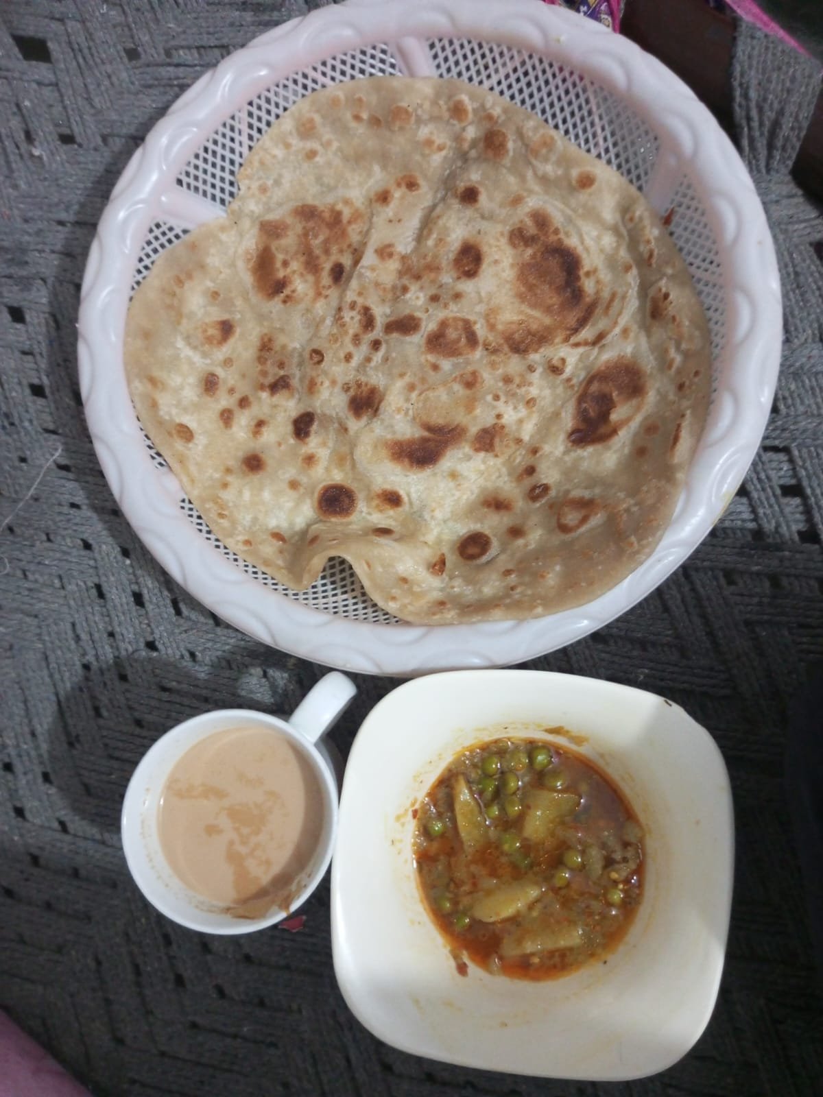 - I made breakfast for my self. I made white pratha. I ate it with potato peas curry and tea. Its a perfect and tasty breakfast. I loved to eat potato peas curry and I am good in making this dish. In my daily routine I must drink tea in morning for breakfast. My breakfast is incomplete without tea. I am a tea lover. It is a good nutrient breakfast. I think we all know the benefits of peas. I made potato peas curry which is beneficial for health. It is a good source of protein and it is best for heart health.
