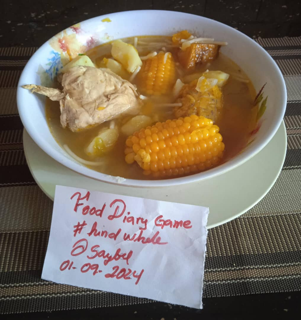 En el almuerzo deguste de una sopa bien rica de pollo con auyama, chacín, papas yuca, y mazorca, que le da un toque aún más exquisito a la sopa, y lo mejor de todo que las mazorcas son de mi cosecha, bien dice el dicho el que cosecha, disfrutará de sus frutos, así mismo es todo hasta en la vida si hace el bien en la vida gozará el frutos de sus acciones.