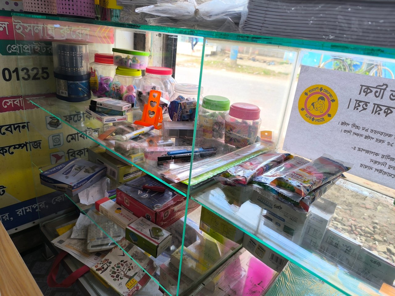 This shop is located in Bamni Bazar, Rangpur Union, Companiganj Upazila, Noakhali District. It is a remote village shop, and many services are provided here at once. Since there is a school and a madrasa nearby, all educational materials are sold here. For example, various types of notebooks, pens, pencils, erasers, geometry boxes, rubbers, scales are sold here. Most of the customers here are young students. There is also a photocopy machine from which various office and court papers are photocopied and various school and college papers are photocopied.