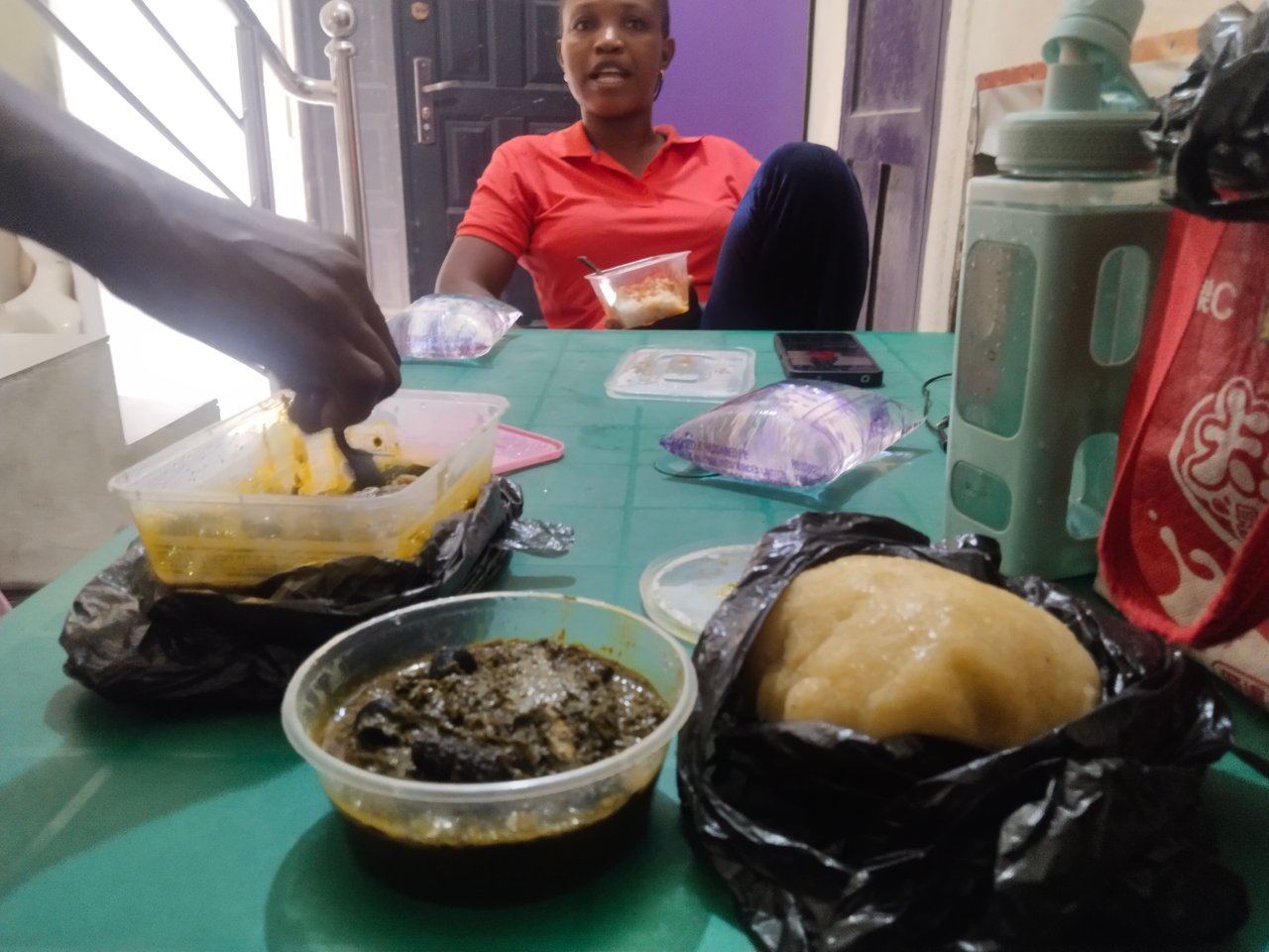 When it was time for our lunch, one of my colleagues said we should do exchange of lunch, she did not bring food to work so she said she will buy me food rice and stew from the restaurant while she eat my soup and garri that I brought from home, because she is tired of eating rice everytime.
