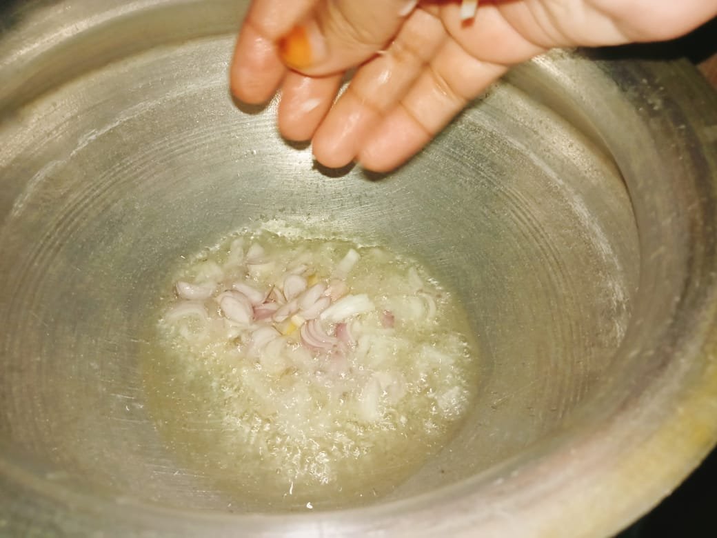 First I put a pot on the stove. When the pot is hot, add 1 cup of oil. Add 1 cup chopped onion to the oil and stir well. Brown the chopped onion in a pan.