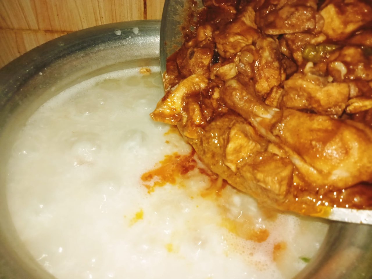 When the water boiled, I removed the lid and poured the cooked chicken into the pot. After mixing the rice and meat well with a spoon, I added some potatoes. Cook for five minutes with the pot closed.