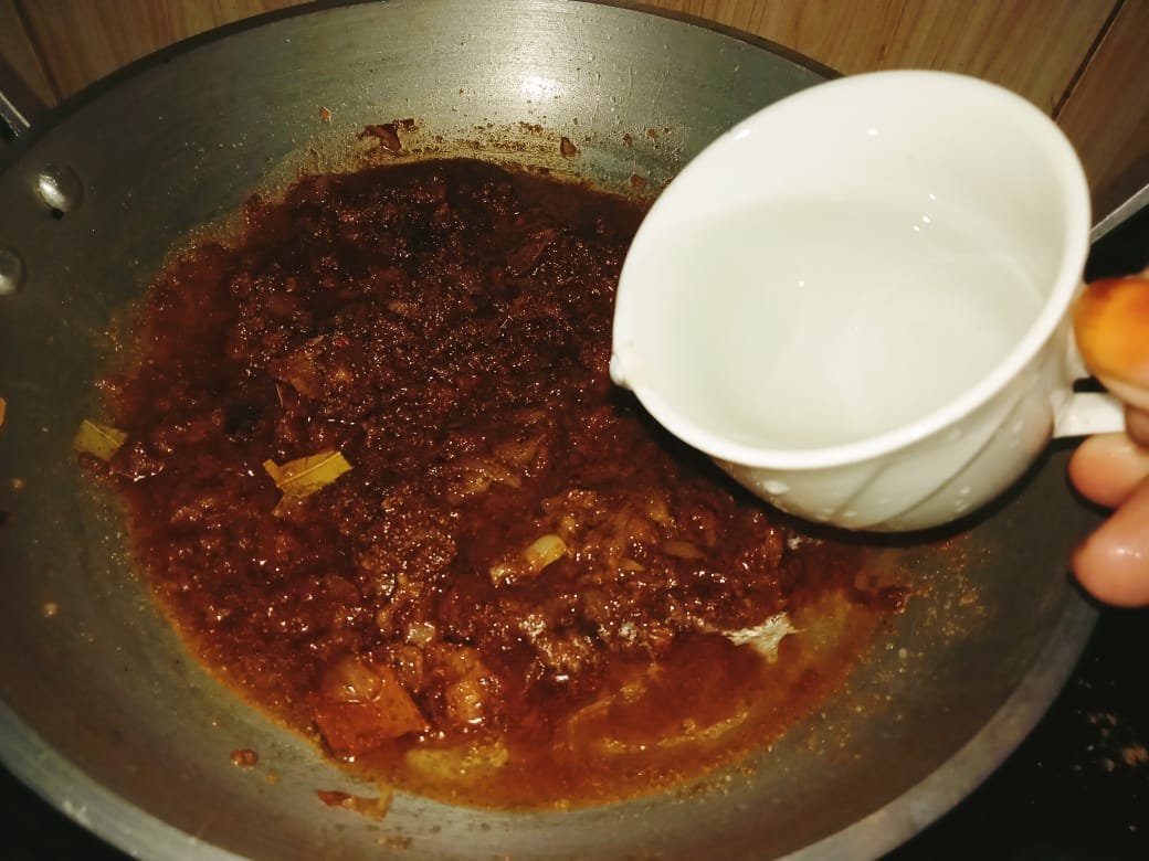 After browning the onions, I added garlic paste, ginger paste, tomato sauce, cashew nut paste, biryani spices, and salt. Stir all the spices well and mix them. Then I gave him a glass of water and took it.