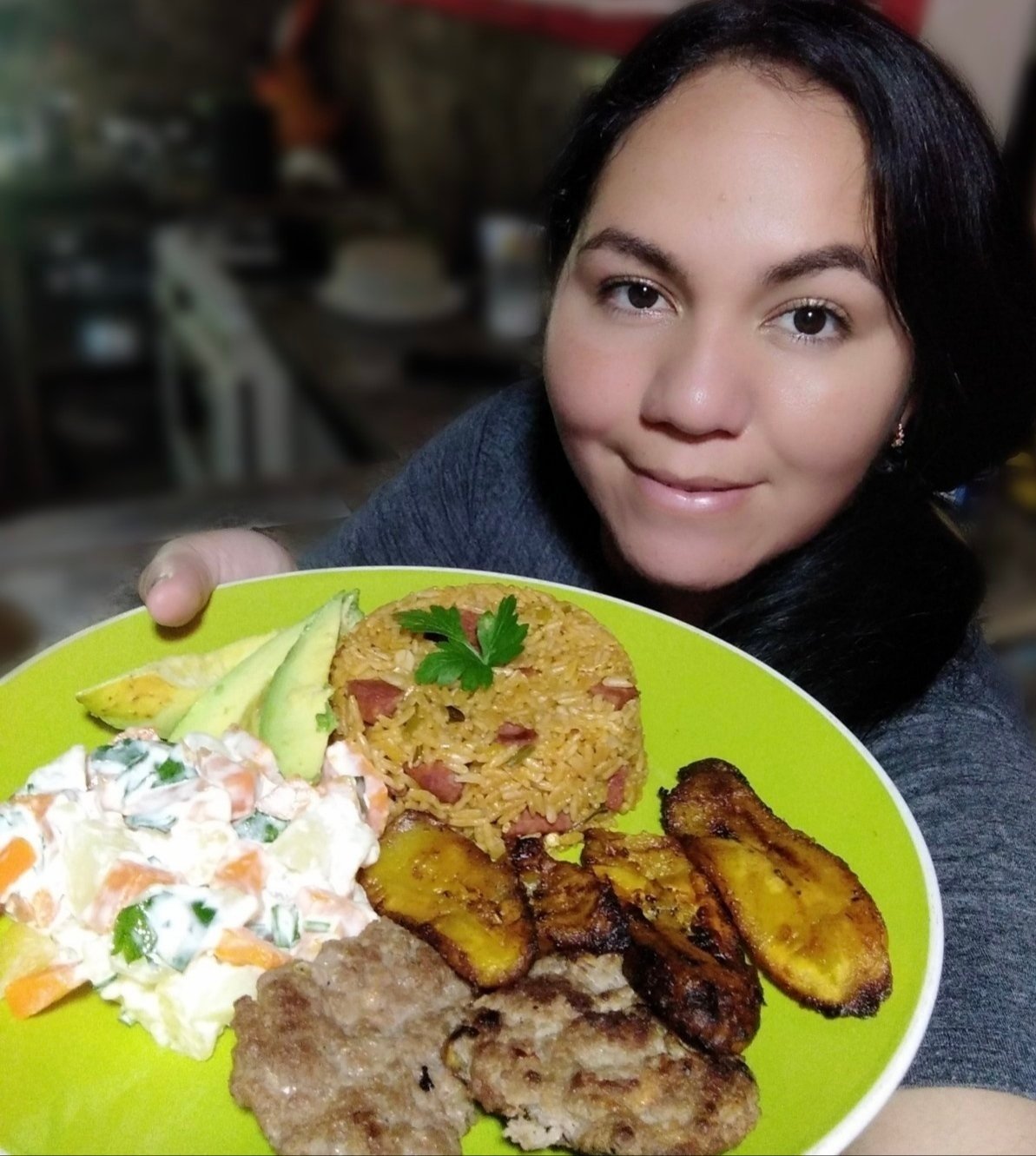 El verde y colores que van desde amarillo al naranja, me encanta un aguacate y su hermoso color, las árepas me gustan más con harina amarilla, el arroz lo suelo preparar a la jardinera pues tan blanco no me gusta, resaltó el color con zanahorias, pimentón y si tengo algún embutido para realzar el sabor de este, se lo agregó.