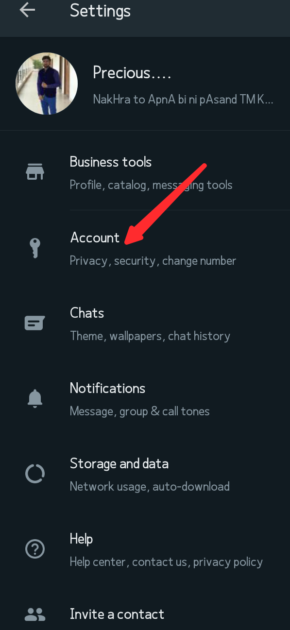 - After clicking the option your whatsApp setting page is open you see many option on screen you only click the option "Account "