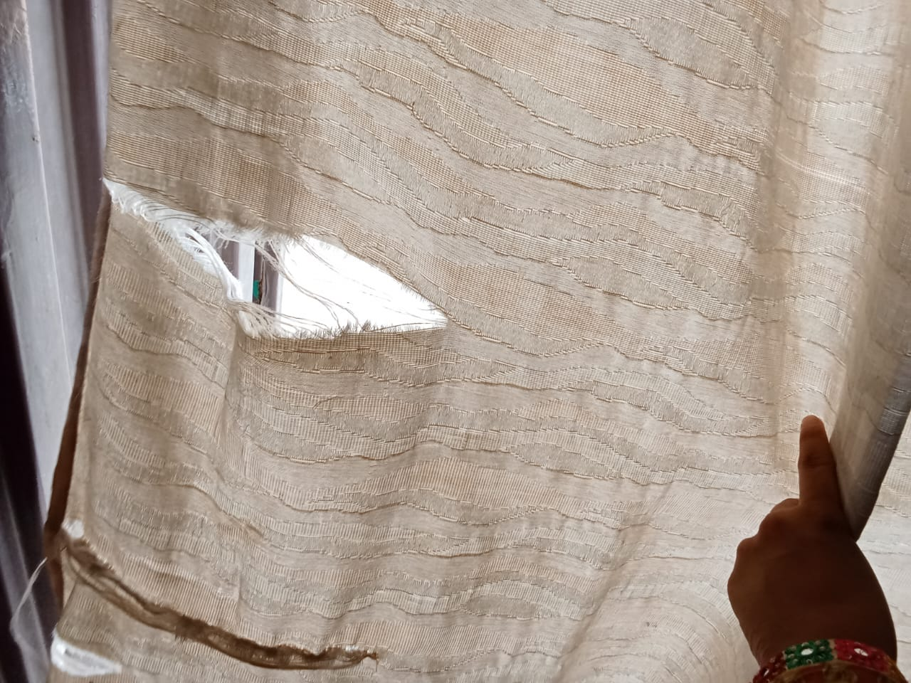 And now I have to show you that the curtain of the main gate of our house was torn and we thought why not sew the curtain again, so I ordered a curtain. My mother bought a curtain from the market and I will show you how it is torn and now it is not good from the outside and because of sadness the curtains are damaged and there is no visible in them. There is no question, we will install a new one and I sewed the curtain and I sewed the curtain. I asked and asked and it took me a lot of time and I was very tired but the good thing is that I managed to put on the curtain and it looked very beautiful.