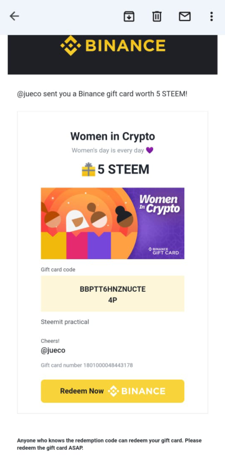 Immediately she redeemed the gift card, I got a message from binance, telling me that she has redeemed the giftcard.