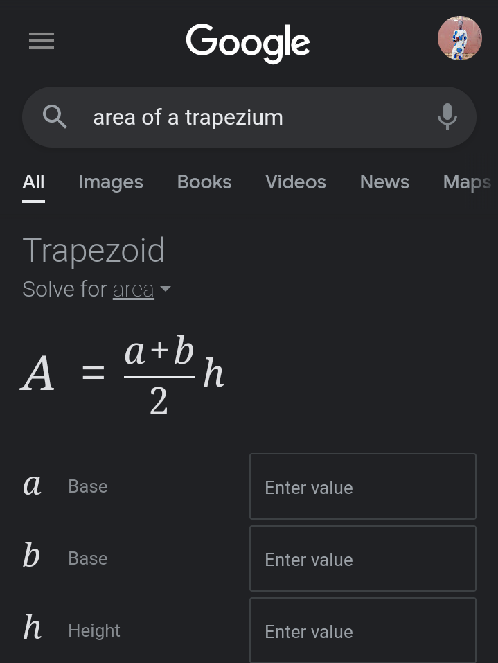 I got the area of a trapezium by inputting the word "area of a trapezium" in the google search bar, and also when I inputed the needed values, I easily got the answer to the area of that trapezium.