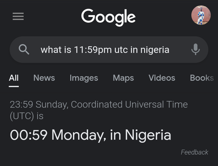 As seen above, I converted 11:59 UTC time to Nigeria time and it equals 00.59 Nigerian time.